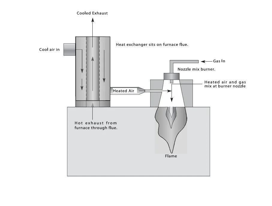 This is a diagram showing the basics of a recuperated system. These systems are attached to furnaces and reheating chambers as a method of improving energy efficiency.