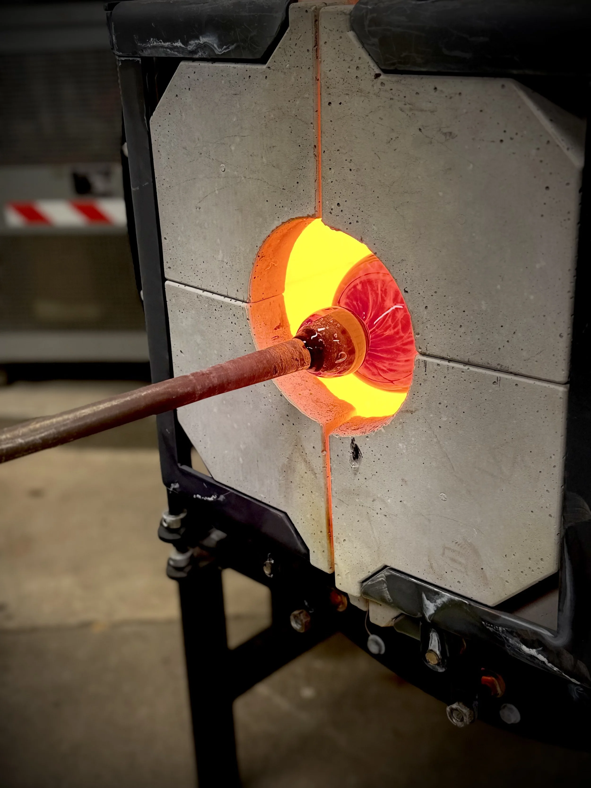 The way a reheating chamber is constructed is a direct result of years of innovation and equipment design. It consists of layers of insulation and refractory inside of a metal chamber with a hole cut on the top for the burner system. The front of the chamber is capped by two hinged doors made of a high-heat refractory intended to trap the heat inside the chamber to reheat the glass to a molten state for manipulating and shaping into art.